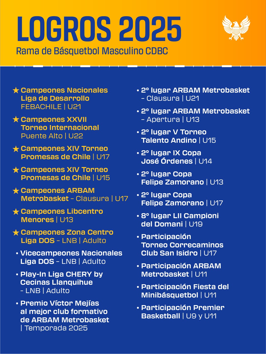El punto más alto de la temporada fue la obtención del título como Campeones Nacionales de la Liga de Desarrollo FEBACHILE (U21), reafirmando el potencial de su cantera. A este logro se sumaron importantes victorias internacionales y nacionales, como el primer lugar en el XXVII Torneo Internacional de Puente Alto (U22) y el doble campeonato en el XIV Torneo Promesas de Chile (U17 y U15). En el ámbito profesional, el equipo adulto brilló al titularse Campeón de la Zona Centro de la Liga DOS (LNB) y alcanzar el vicecampeonato nacional, logrando además el acceso a los Play-In de la máxima categoría nacional (Liga CHERY).